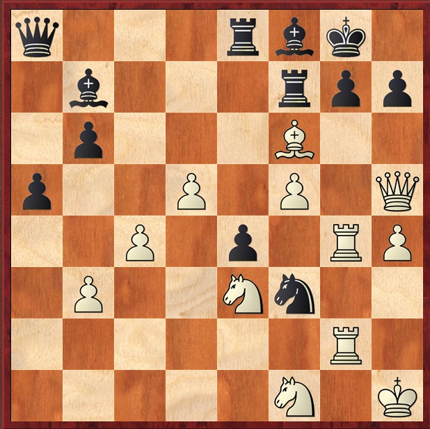 In der Diagrammstellung folgte durchschlagend 33.Lxg7! Txg7 34.f6! Te5 35.Txg7+ Lxg7 36.Txg7+ und 1-0, weil Schwarz durch 37.Df7# oder 37.Dxh7# mattgesetzt wird. 3,5:2,5.